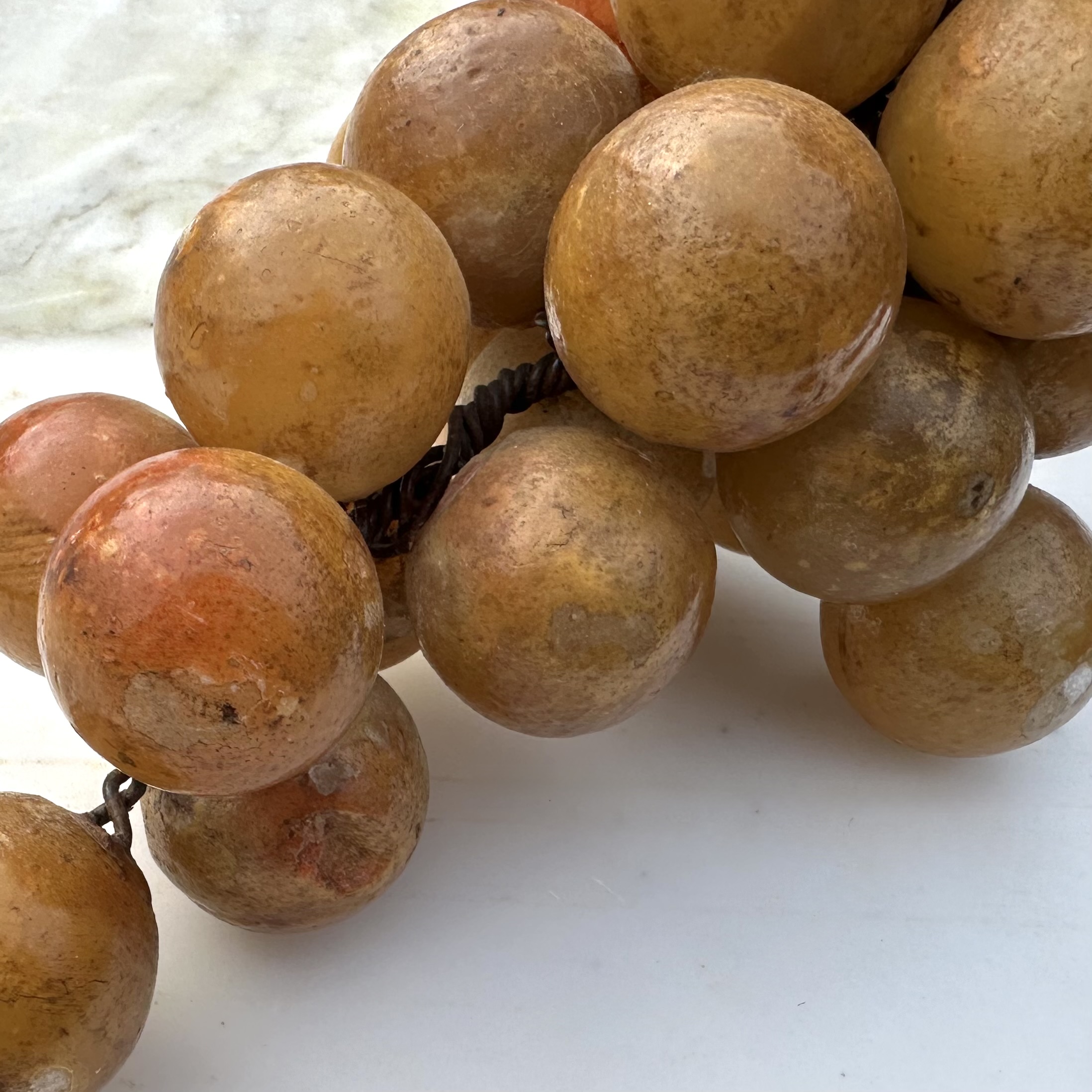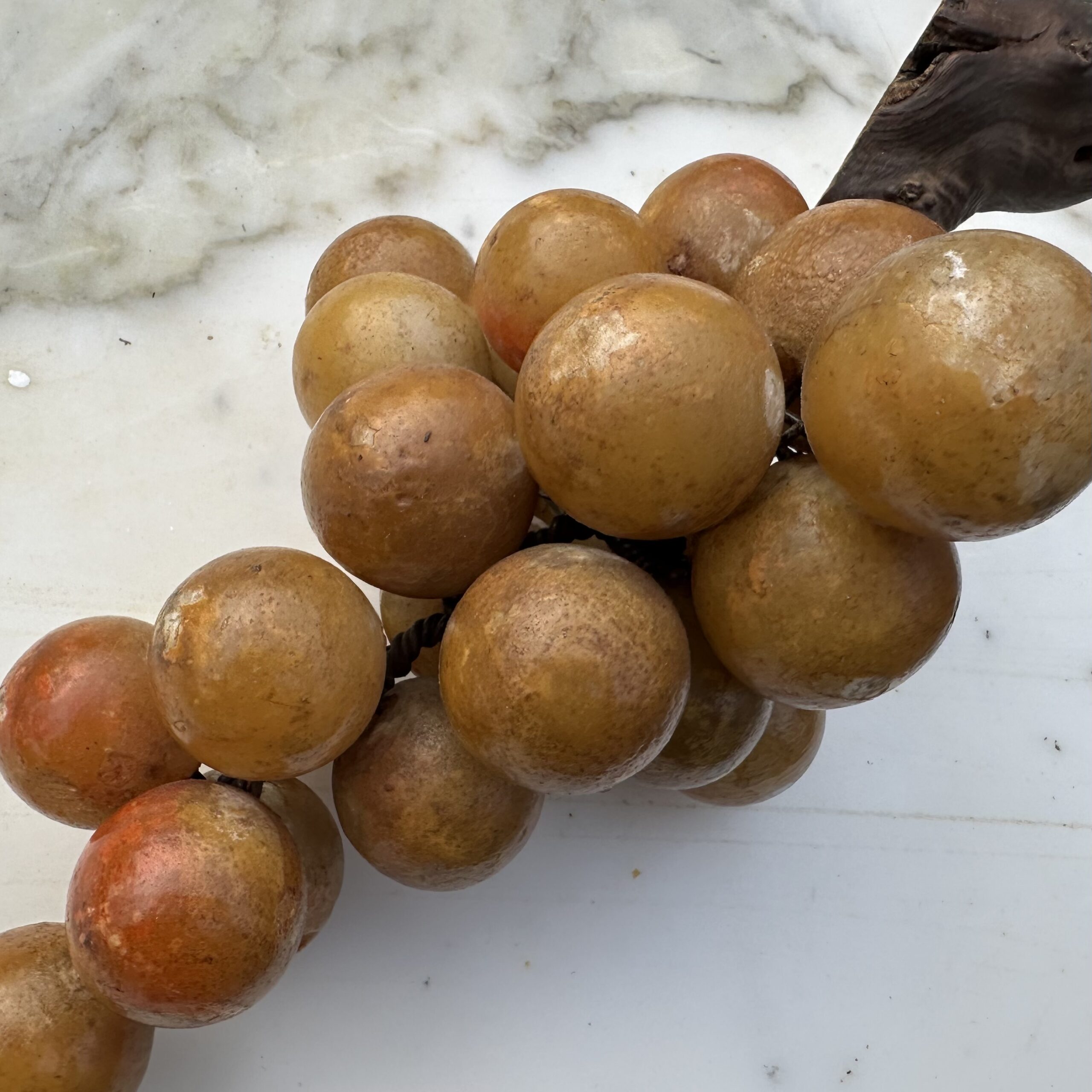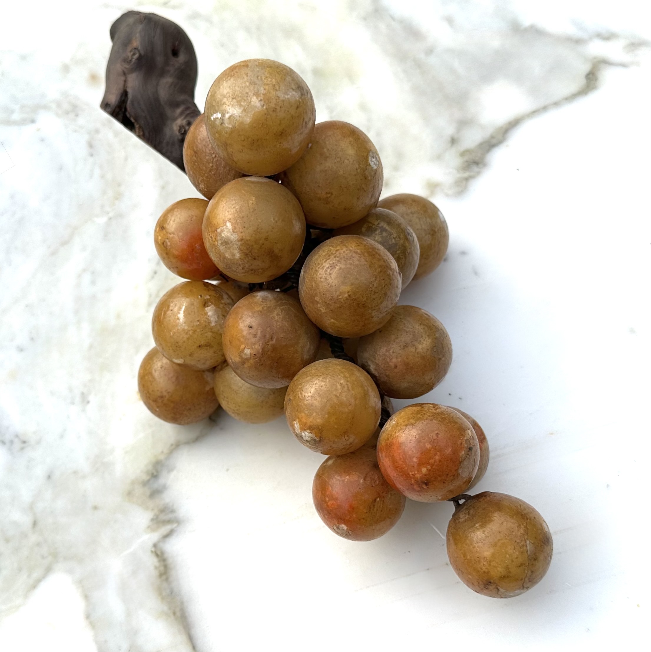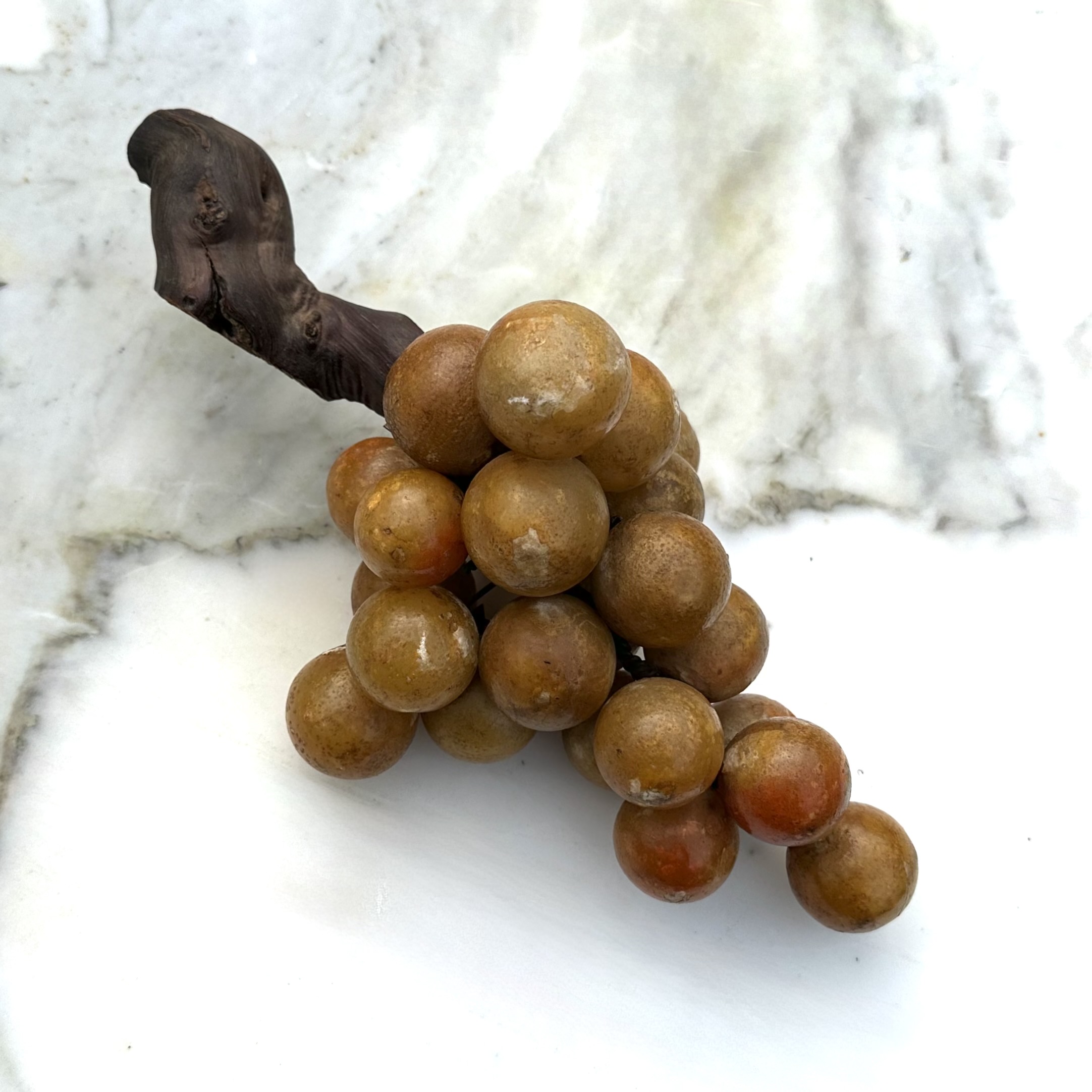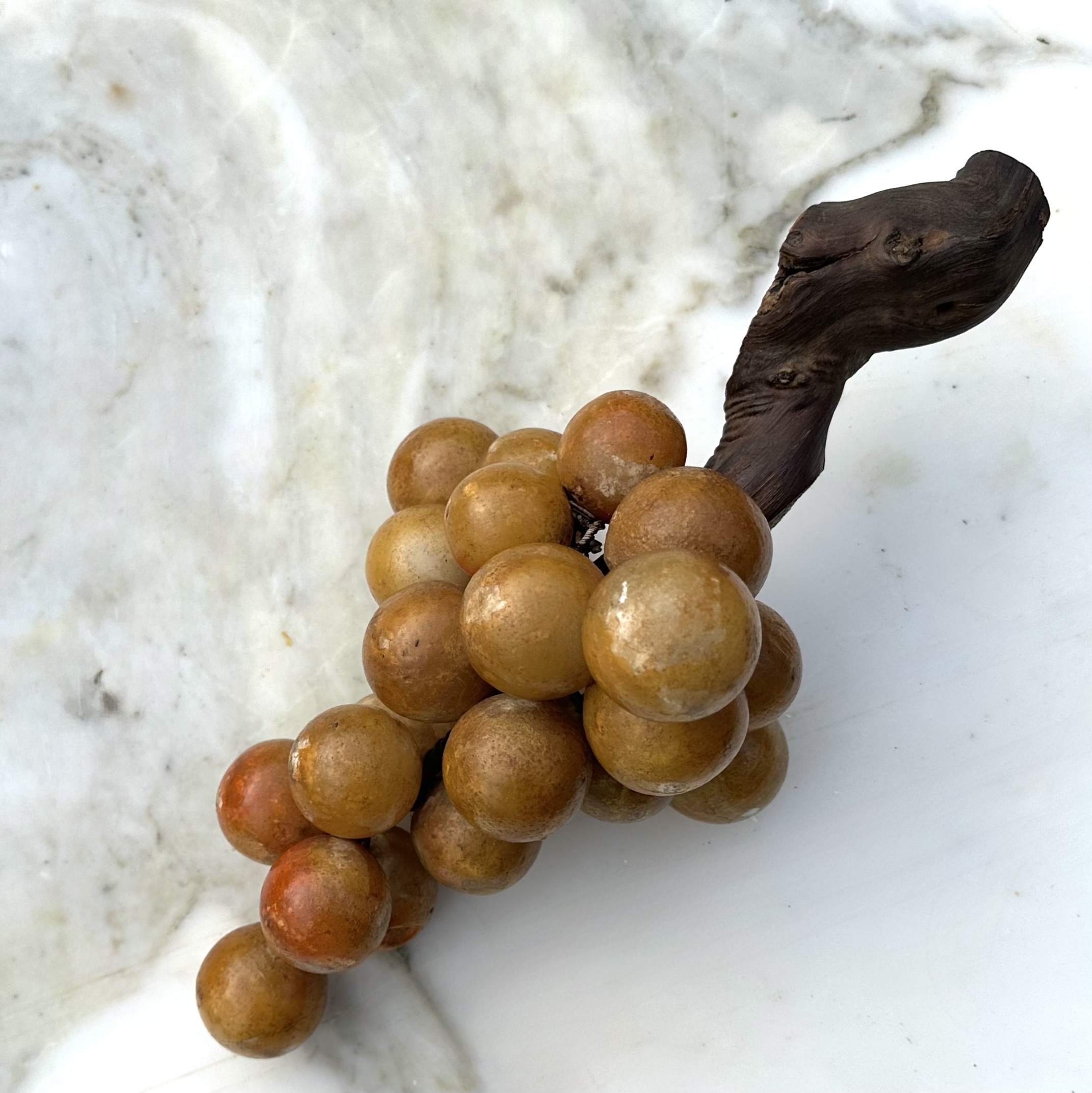 Antieke grote albasten druiventros met houten steel.
