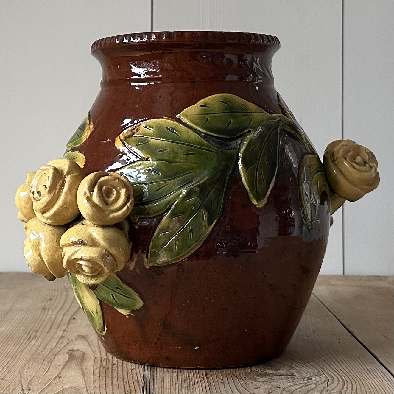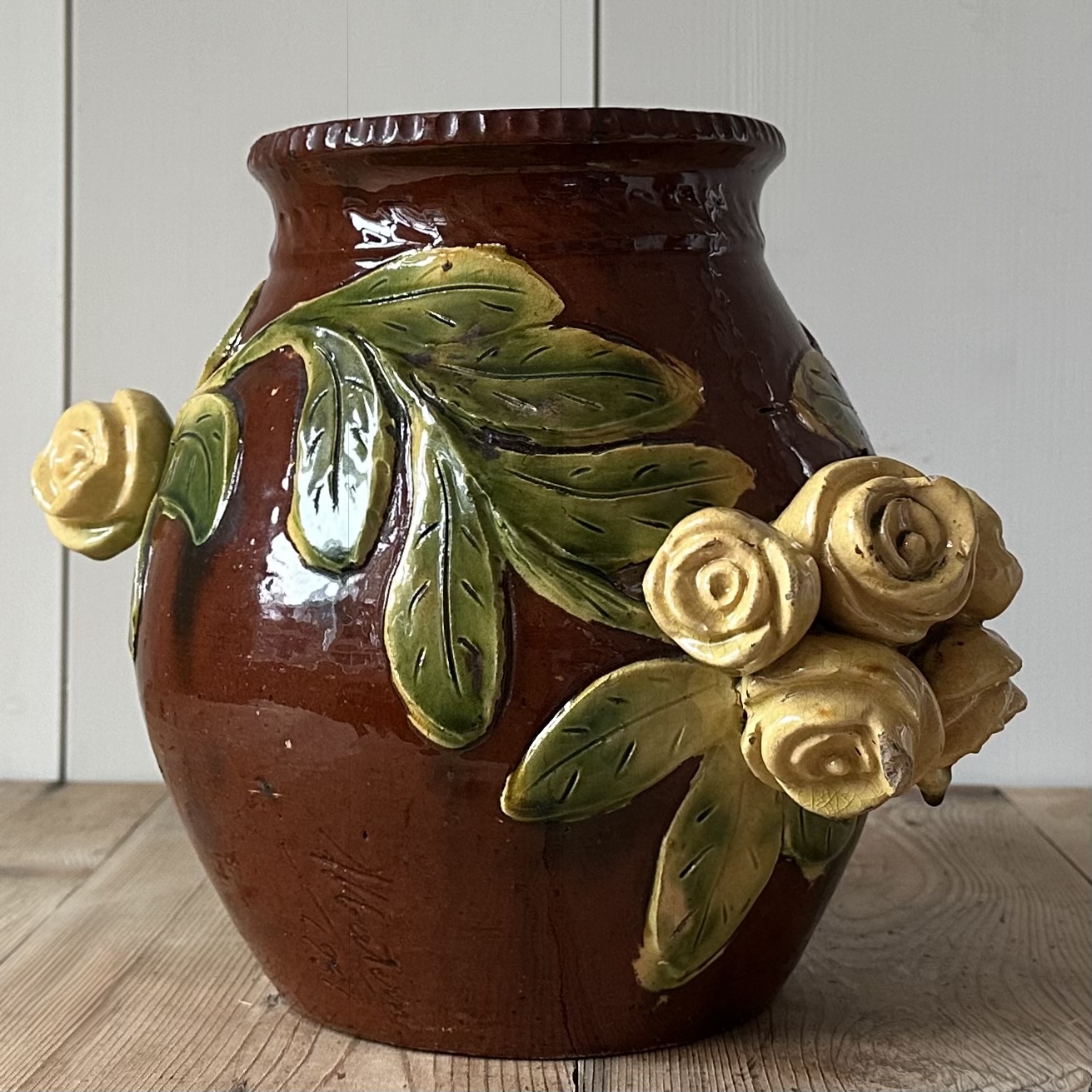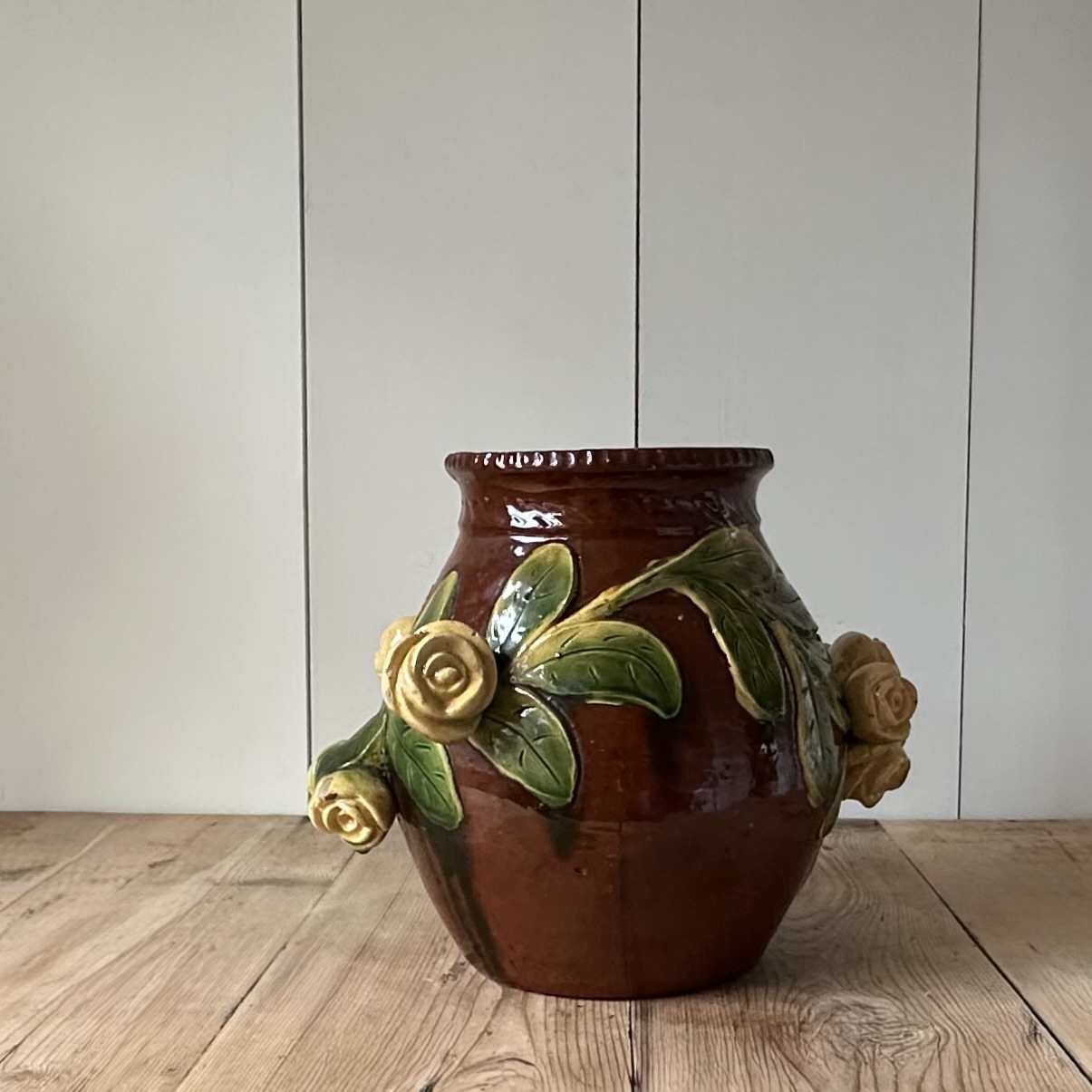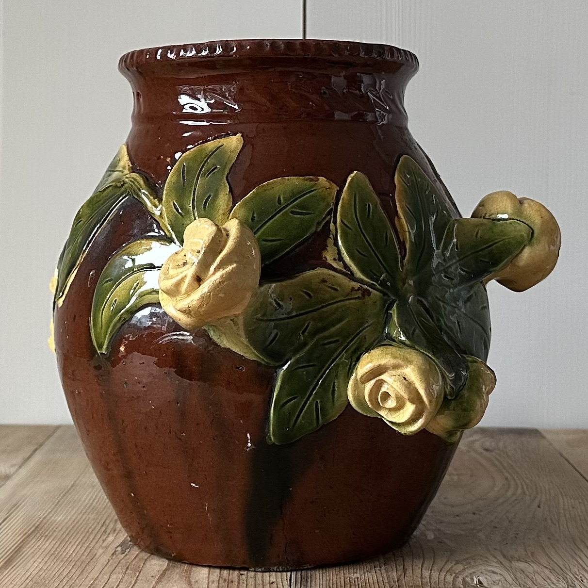 Majolica vaas met roodbruin glazuur en gedecoreerd