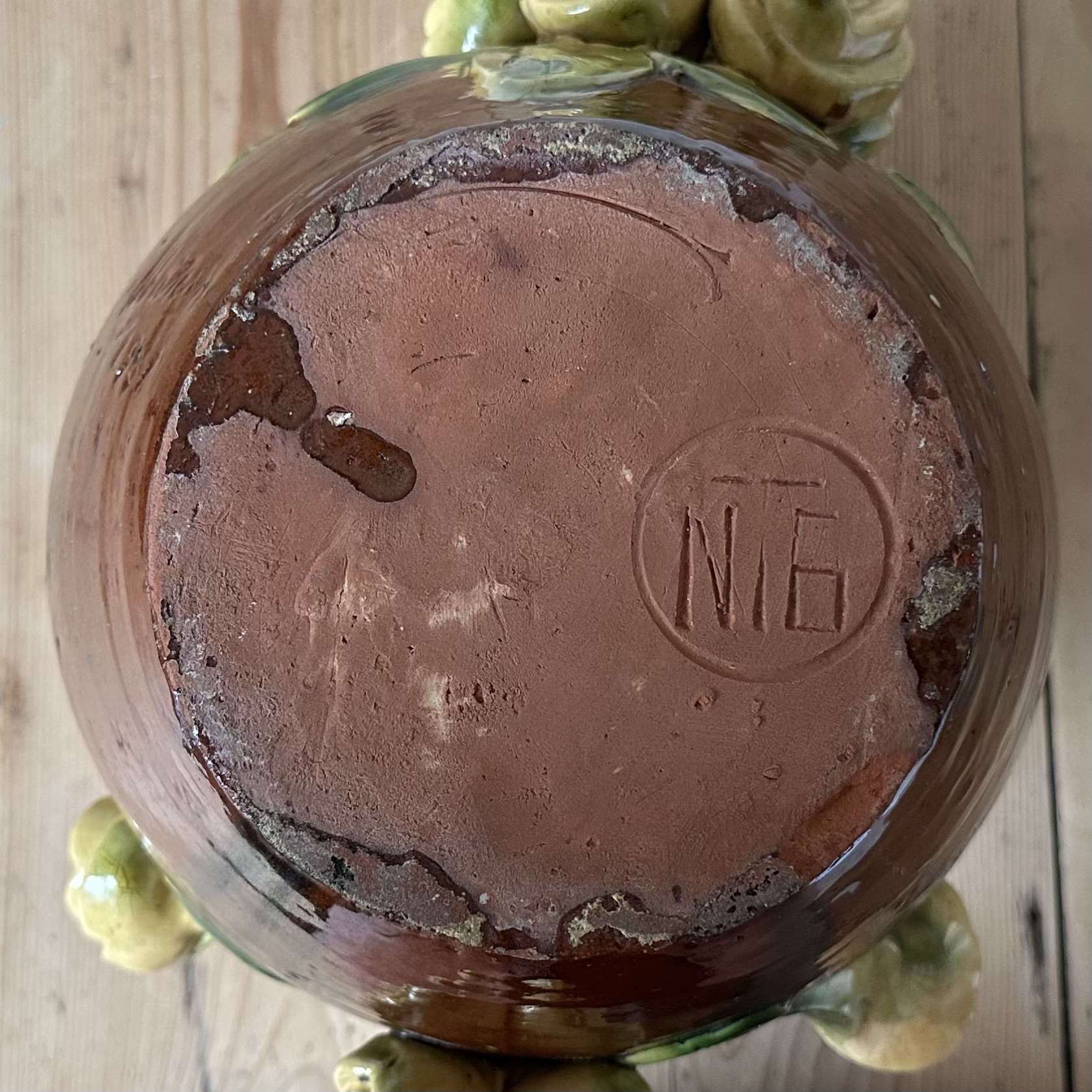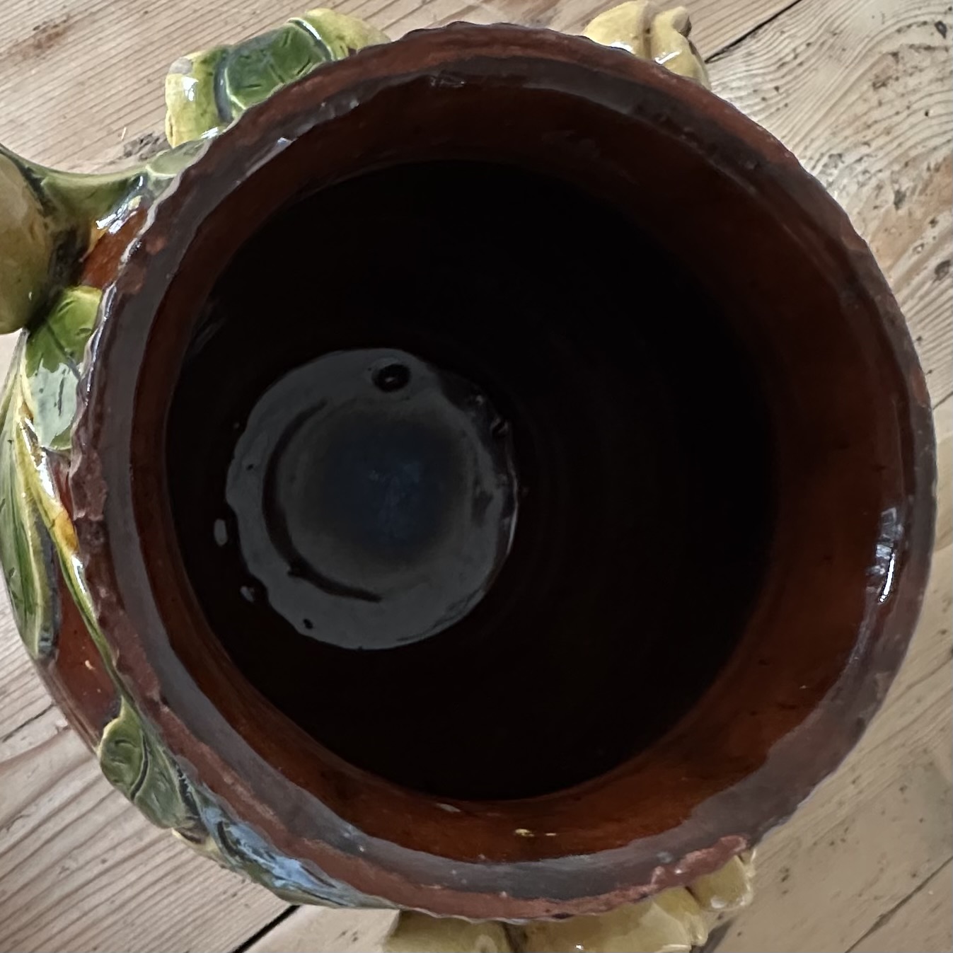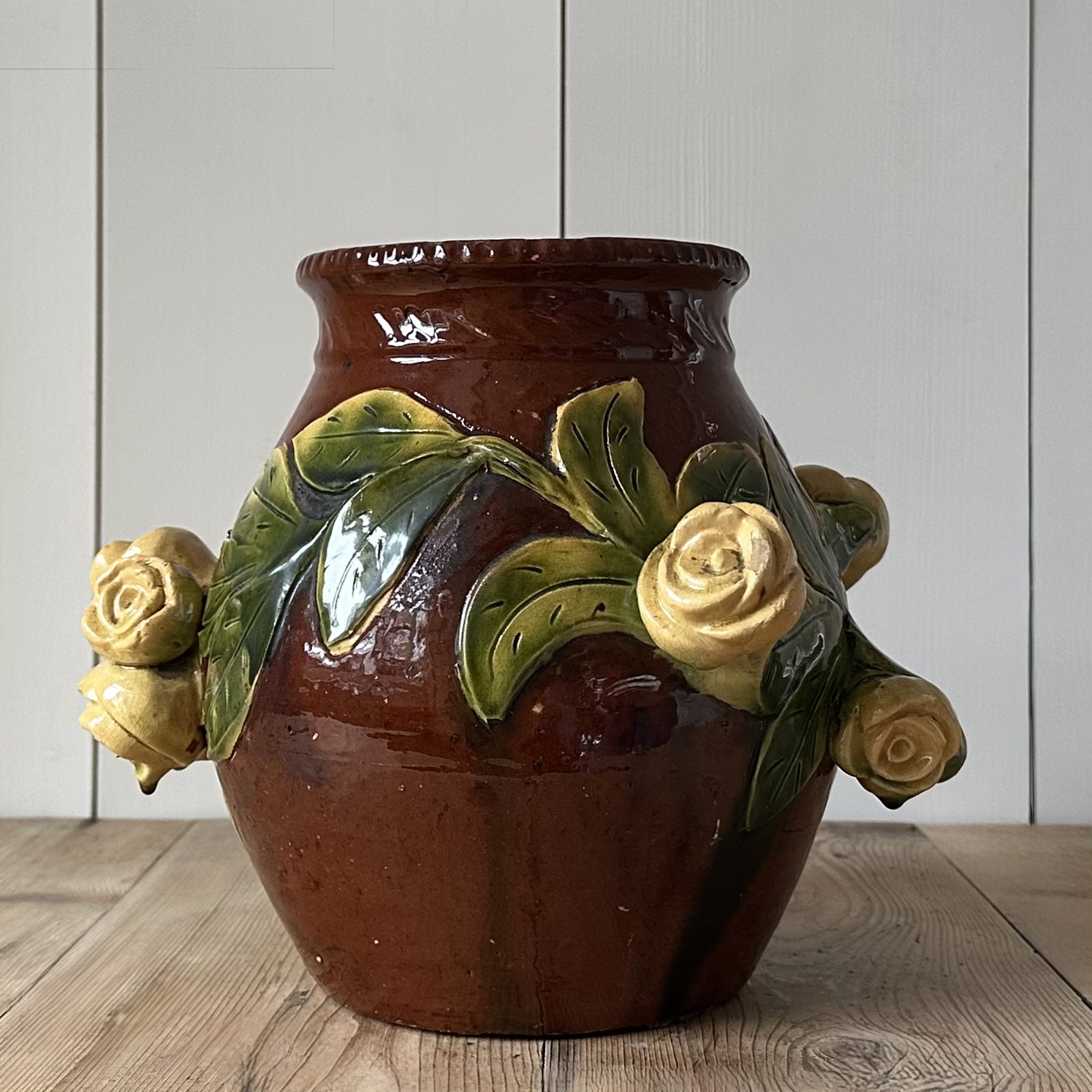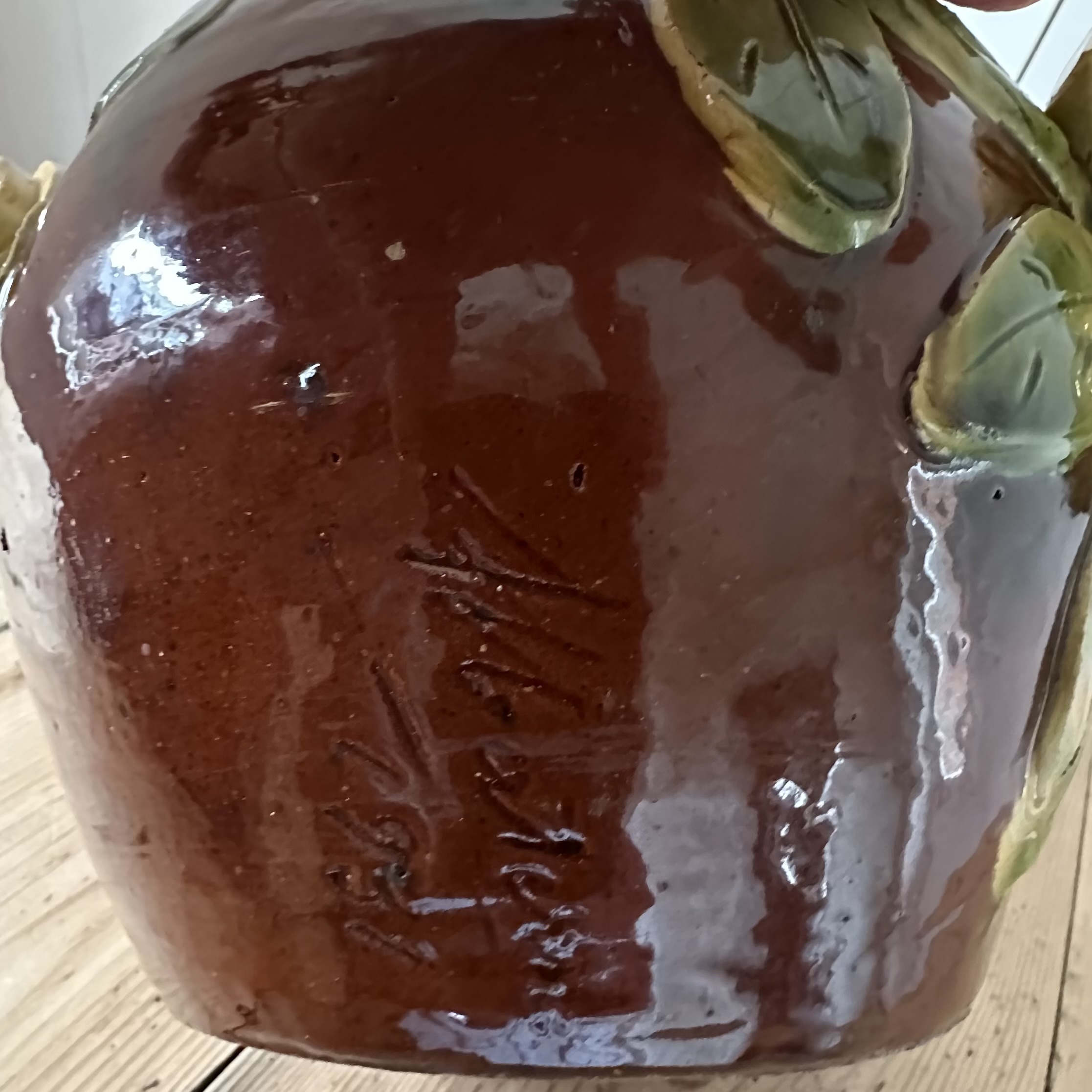 Majolica vaas met roodbruin glazuur en gedecoreerd