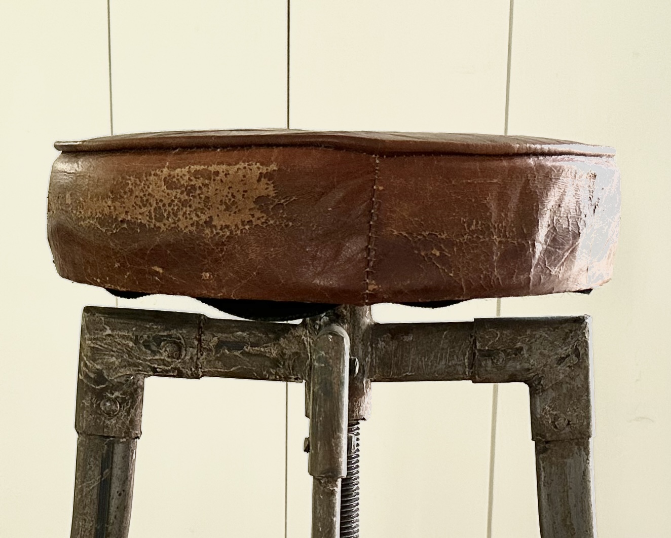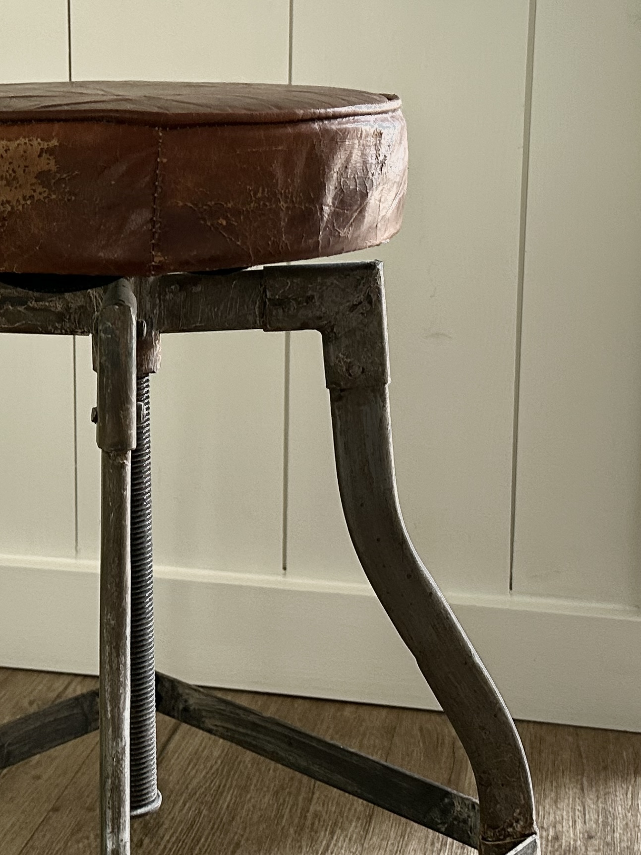 Mooie industriële draaikruk met leren zitting en ijzeren onderstel.