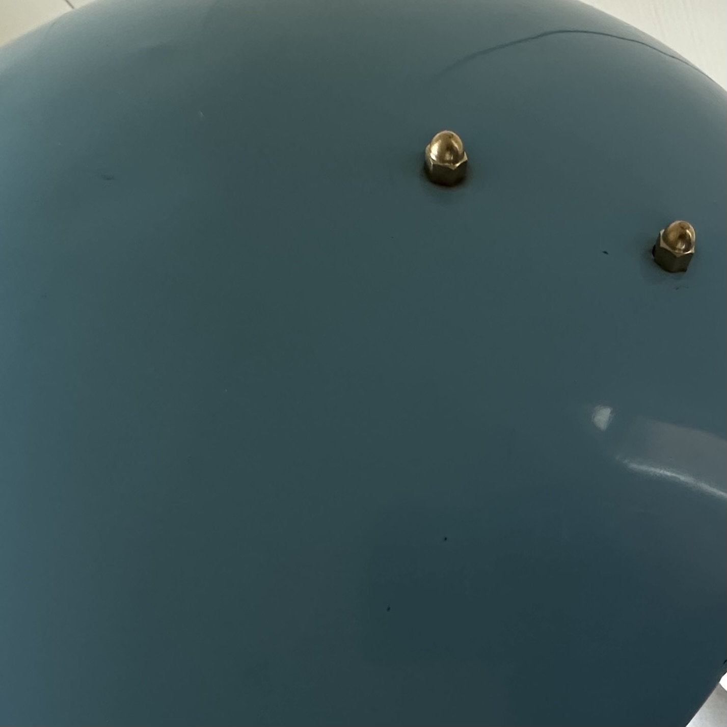 Deze lamp is in vintage blauw en past uitermate goed bij messing details.
